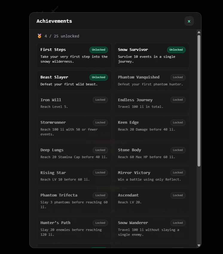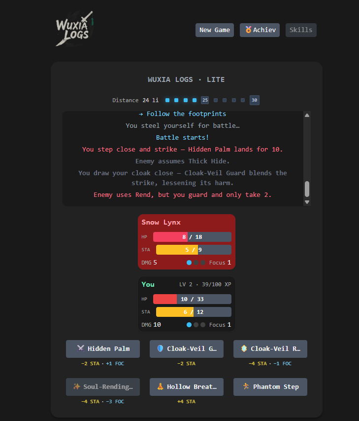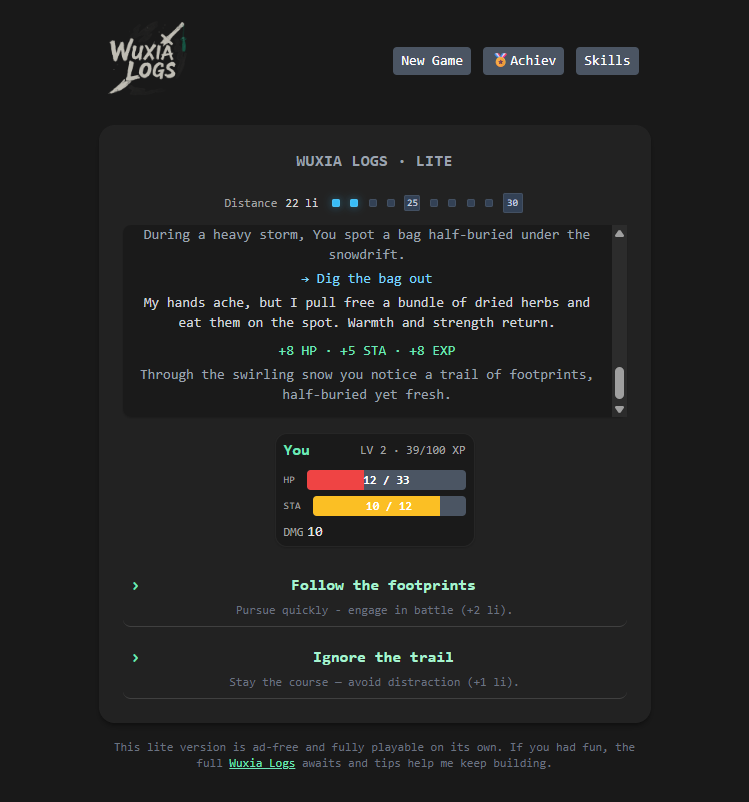 Wuxia Logs · Lite is a text-based survival RPG set in a snowbound mountain pass. Every choice matters: risk crossing thin ice, endure blizzards that drain your strength, or confront wolves and exiled disciples hunting in the storm, all while fleeing the phantoms that haunt these mountains.